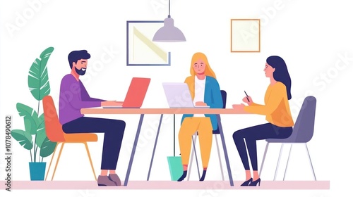 Three colleagues are sitting around a table in an office, working on their laptops and talking.