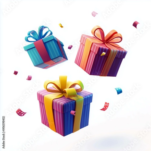Three colorful gift boxes floating in the air with confetti
