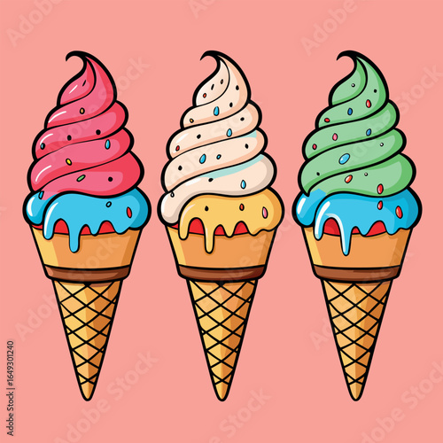 Three colorful ice cream cones with sprinkle toppings line up on a salmon backdrop