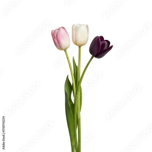 Three colorful tulips isolated on transparent background a pink tulip, a white tulip, and a dark purple tulip stand tall with their vibrant green stems and leaves, creating a striking contrast against