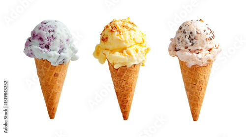 three cones of ice cream with different flavors