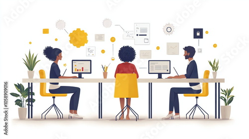Three coworkers work together in a modern office space. The diverse team members work on their laptops and computer monitors.