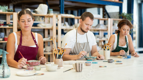 Three craftsperson are busy painting clay products. They are sitting near desktop, using brush and paints, painting product made of raw clay. Working together in pottery workshop.