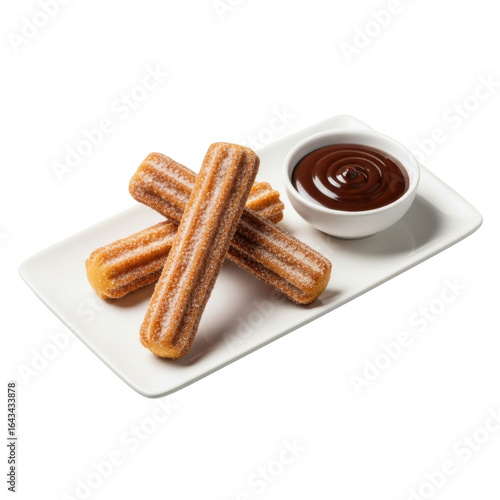 Three crisp, golden-brown churros with sparkling cinnamon sugar and dark chocolate dipping sauce on a white plate, isolated on transparent background, studio lit. Commercial food photography concept