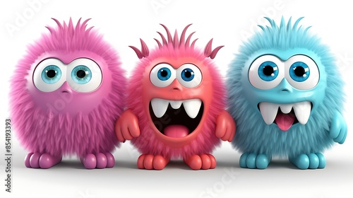 Three cute and colorful monsters are standing in a row. They have big eyes, sharp teeth, and fluffy fur. The monsters are pink, blue, and purple.