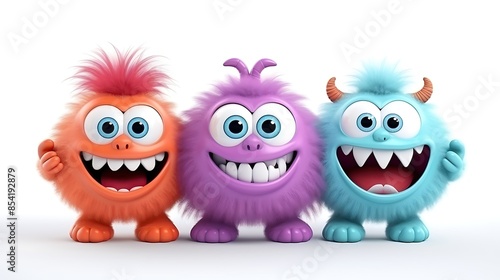 Three cute and colorful monsters are standing in a row. They have big eyes, toothy smiles, and fuzzy fur.