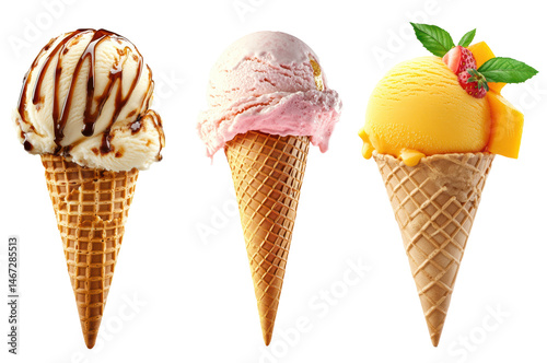 Three Delicious Ice Cream Cones: Vanilla, Strawberry, and Mango Sorbet