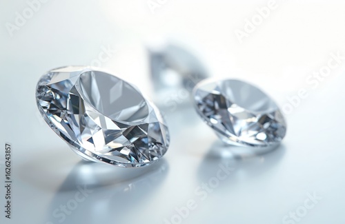 Three exquisite shiny diamonds isolated on clean white background. Gemstones show brilliant clear facets, showcasing luxury and wealth. Perfect for jewelry, finance, or high-end product concepts.
