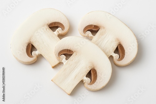 Three freshly sliced white mushroom caps