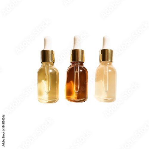 Three Glass Bottles with Droppers Filled with Golden, Amber, and Light Yellow Liquids