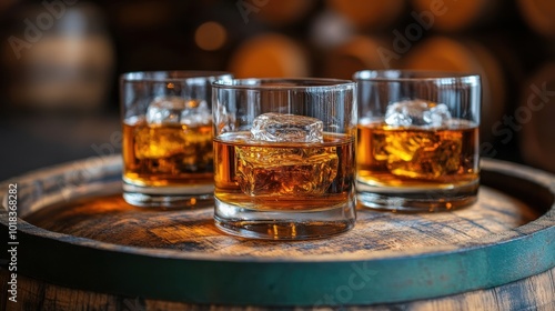 Three glasses of amber liquid with ice cubes, resting on a wooden barrel, a perfect setting for an evening of relaxation