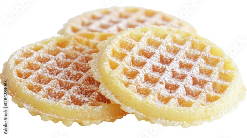 Three Golden Round Waffles Topped with Powdered Sugar on a Plain White Background