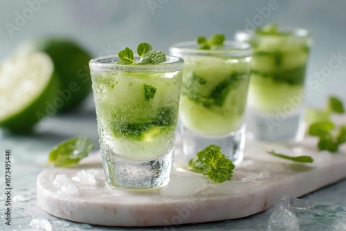 Three green mojito cocktails with lime and mint served in clear glasses