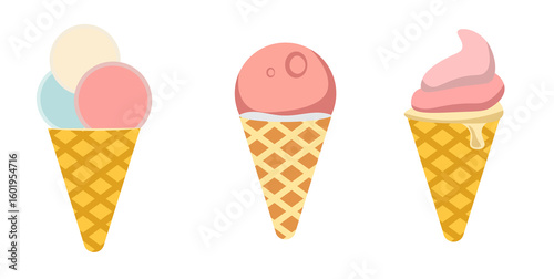Three ice cream cones are illustrated. The first features two scoops, one cream-colored and the other light blue, in a waffle cone