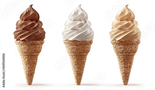 Three ice cream cones, chocolate, vanilla, and a light beige/tan flavor, stand tall against a white background. Each cone holds a generous scoop of ice cream