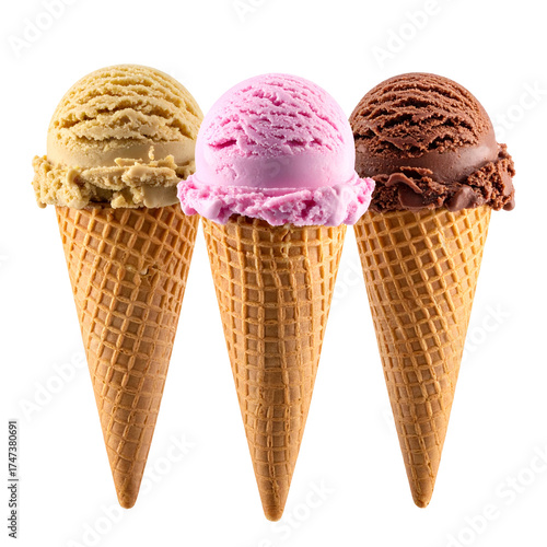 Three ice cream cones in a row, featuring vanilla, strawberry, and chocolate scoops