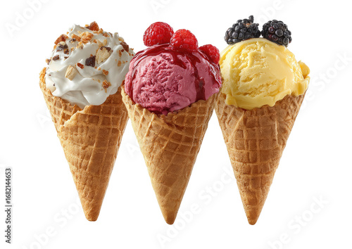 Three ice cream cones, showcasing different flavors
