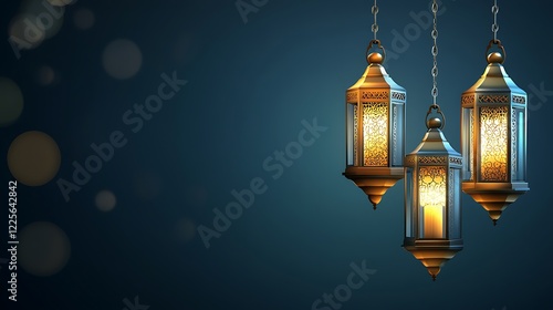 Three Illuminated Lanterns Hanging Against Dark Background