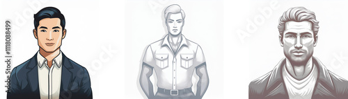 Three illustrated portraits of men; one in a suit, one in a casual shirt, and one in a jacket. Each shows a different hairstyle and expression.