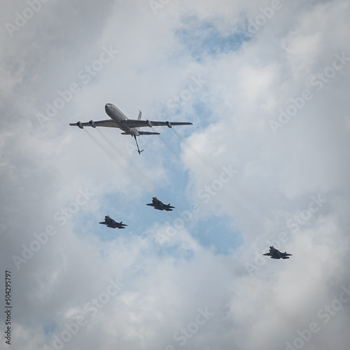Three Israeli Stealth Fighter Jets Flying in Formation together with a Refueling Jumbo Jet in the air parade as part of Israel's Independence Day Celebrations