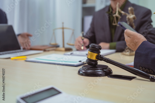 Three lawyers in a meeting at the table in an office, discussing business, civil and commercial law, labor law, marketing and advertising law,offering legal consulting and case management services.