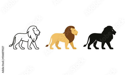 Three lion silhouettes in various styles: outline, colorful, solid black