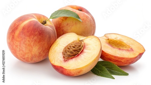 Three Nectarines with Leaves Composition, Close-up, Fresh Fruit, White Background, Still Life Photography. Nectarine, Fruit