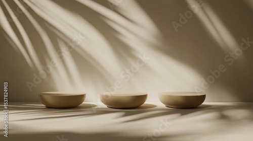 Three neutral-toned round pedestals cast in natural light.