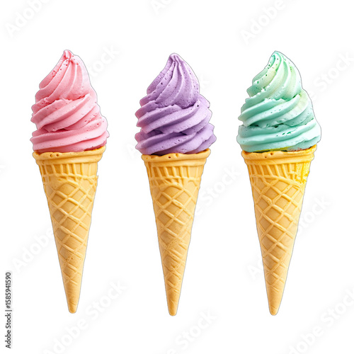 Three pastel-colored soft-serve ice cream cones; pink, purple, and mint green swirls in crisp waffle cones