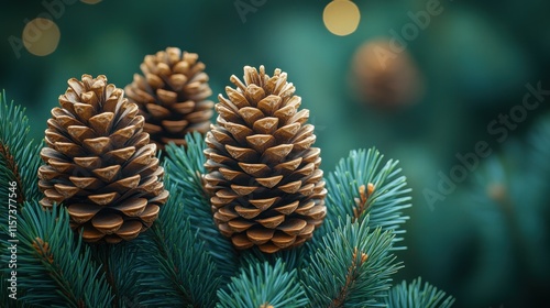 Three pine cones on a pine branch.