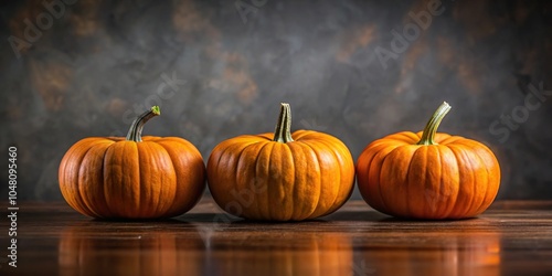 Three ripe pumpkins on a wooden table with a gray background, with selective focus and reflections