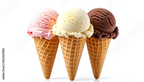 Three scoops of delicious ice cream in waffle cones: strawberry, vanilla, and chocolate; vibrant, appetizing, and perfect for summer advertising.