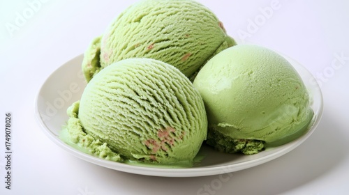 Three Scoops of Green Ice Cream on a Plate, Pistachio, Dessert, Sweet Treat, Summer, Refreshing, White Background, Close-Up, Food Photography