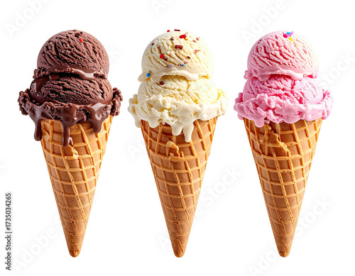 Three scoops of ice cream, chocolate, vanilla, and strawberry, in crispy cones