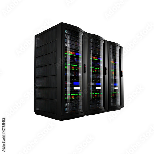 Three sleek, modern server racks with illuminated panels stand in row, showcasing advanced technology and data processing capabilities. servers are designed for efficient data management