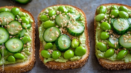Three slices of toast topped with avocado, edamame, cucumber, and sesame seeds.