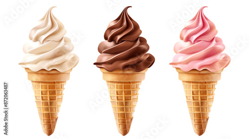three soft serve ice cream cones on isolated background, neapolitan - chocolate, vanilla, strawberry - print quality