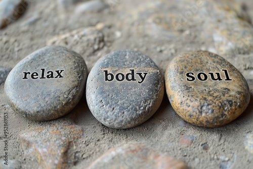 Three stones with 'relax', 'body', and 'soul' text on them, promoting wellness and balance.