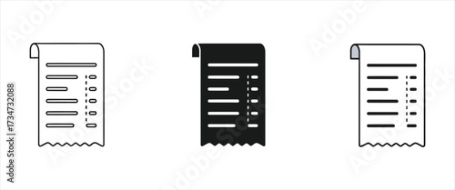 Three styles of receipt icons including outline solid and flat design on a white background Keywords: receipt, bill, invoice, check, order, transaction, payment, shopping, retail