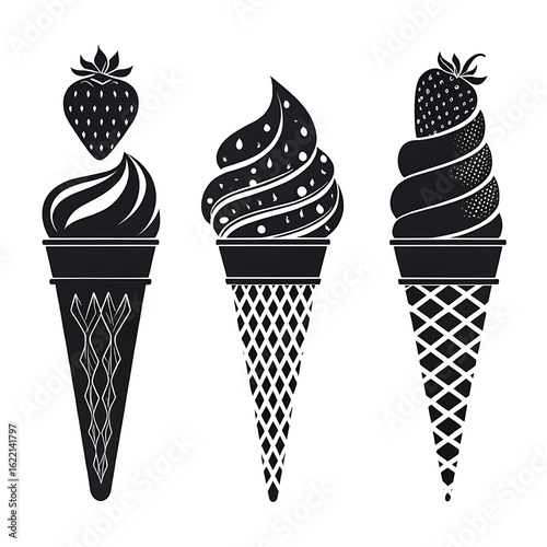 Three stylized ice cream cones with strawberries isolated on white background