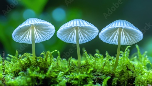 Three tiny white mushrooms on moss