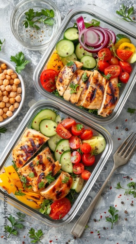 Three trays showcasing a variety of ingredients such as chicken, cucumber, tomatoes, and chickpeas