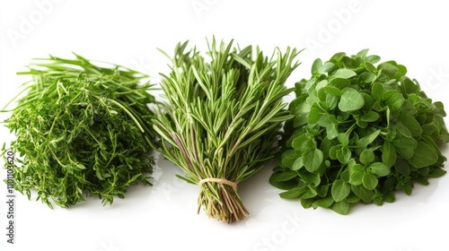Three varieties of fresh herbs displayed on a white background showcasing their vibrant colors and textures ideal for culinary use.