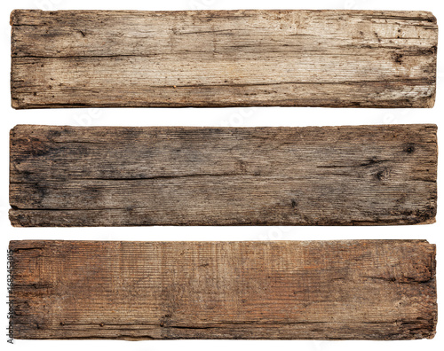 Three weathered wooden planks. Close-up view of aged, textured wood surfaces. Horizontal orientation. Natural tones of brown and gray