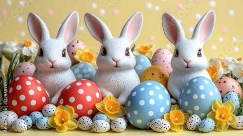 Three white Easter bunnies surrounded by colorful eggs and daffodils on a pastel yellow background.