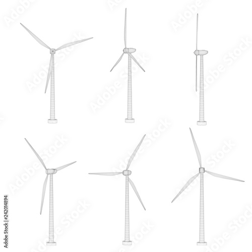 Three wind turbines. Set of vector images. Concept natural Energy