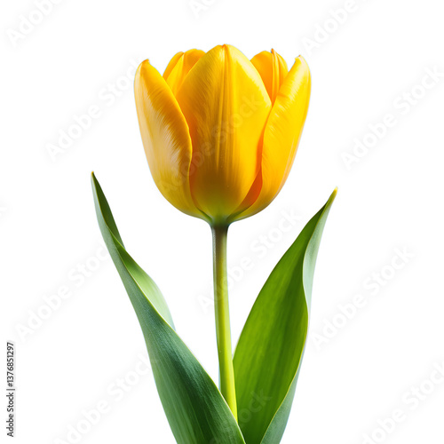 Three yellow tulips isolated on white background with vibrant petals and green stems, symbolizing spring beauty and nature