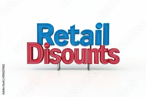 Three-dimensional text; retail discounts; blue, red lettering.