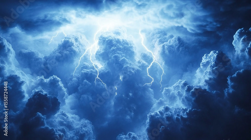 Thunder and lightning on a background with a blue sky. Light thunderstorm