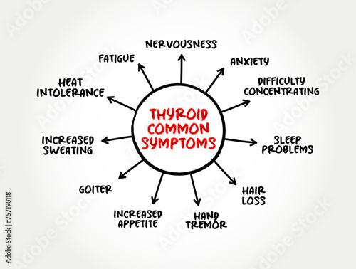 Thyroid (small, butterfly-shaped gland in the front of your neck) common symptoms mind map, text concept background